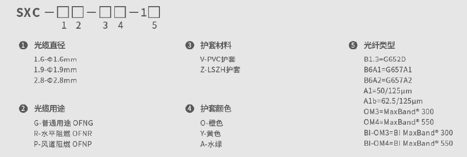 GJXH:室內(nèi)分支型光纜,其中“G”代表通信用光纜,“J”表示室內(nèi),“XH”表示松套管結(jié)構(gòu)。