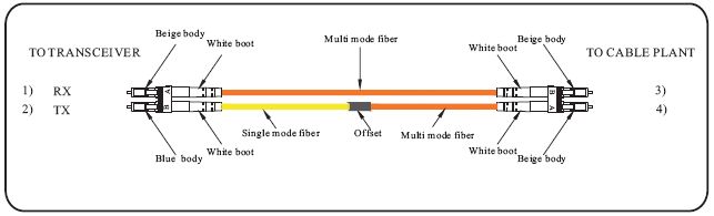 If your gigabit LX switch is equipped with SC or LC connectors,please be sure to connect the yellow leg(Singlemode)of the cable to the transmit side,and the orange leg(multimode)to the receive side of the equipment.