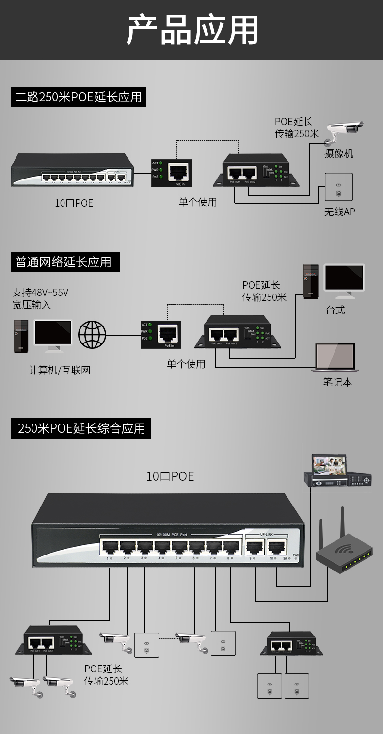 Extend: 10M 1-2 port 250m (right side, indicator light flashes) Poe watchdog open
