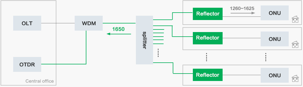 End-to-end OTDR measurement from OLT to ONT is often difficult because of the high losses and complex network that taps bring. The application of fiber optic reflectors is a cost-effective solution to help OTDR detection and is the best way to achieve real-time end-to-end (OLT to ONT) monitoring of optical networks in FTTx networks.