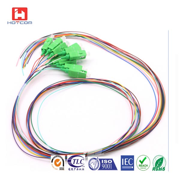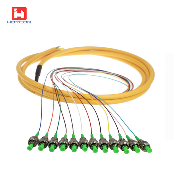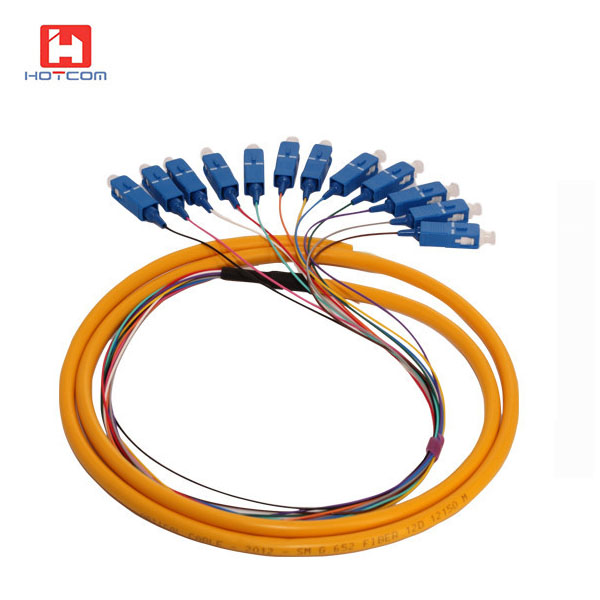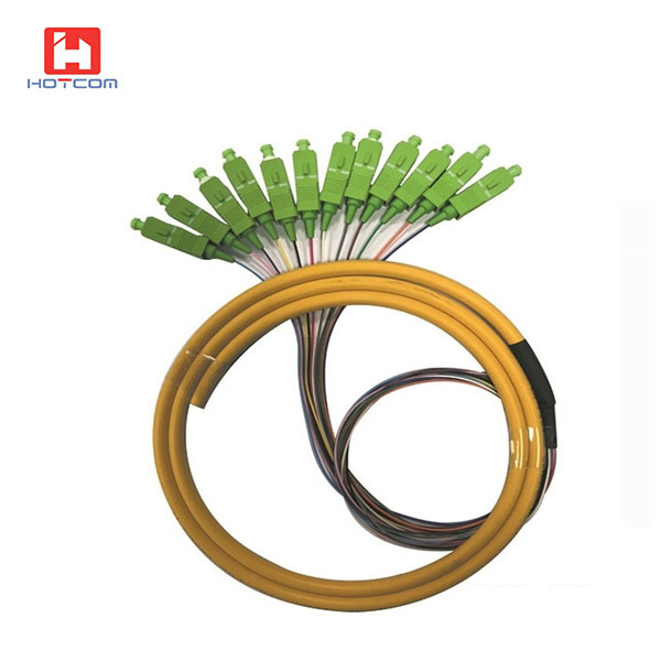 Hotcom bundle/fanout fiber optic pigtail, multi-core pigtail contains 12 cores, 12*color pigtails in a fan bundle, easy to use, one end fusion, one end with a connector, this is called bundle pigtail.