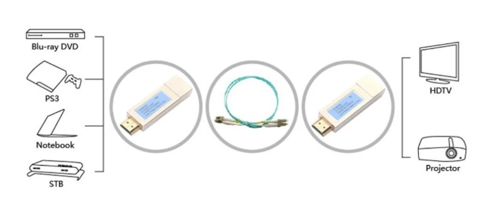 1.Connect HT401-4KHDMI-T-mini 4k HDMI Optical Transceiver (signal port) with LC duplex OM3 fiber patch cord or 9/125um singlemode fiber patchcord (For example DVD,PS3,STB, laptop ect).