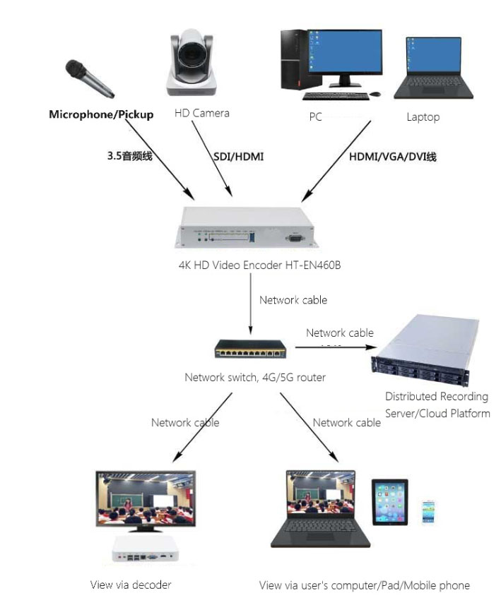 HT-EN460B 4K HD video codec, supports 4K encoding, 4K decoding display, HD audio codec, recording and VOD. Support RTSP/RTMP/TS streaming and other protocols, support cell phone/Pad to watch live and on-demand. Support H265/H264 encoding and decoding.