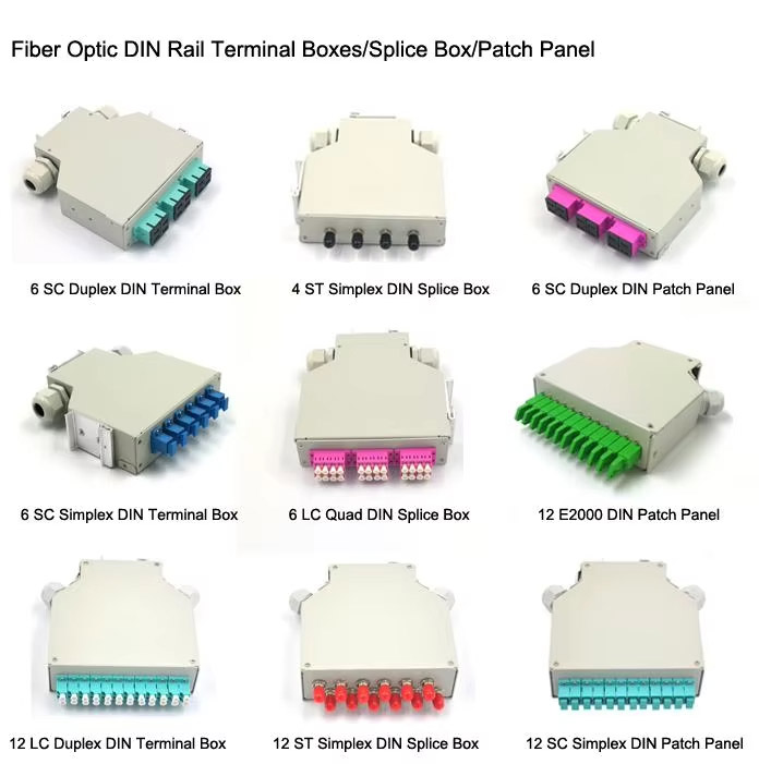 The HT2005-DR-6SCD DIN-rail fiber optic terminal box produced by H&T Optoelectronics can be produced in 2 core, 4 core, 6 core, 8 core, 12 core, 24 core and can be configured with different panels, such as ST single core panel, LC single fiber panel, LC dual core panel, SC single core panel, SC dual core panel, FC single core panel, E2000 single fiber panel and so on.