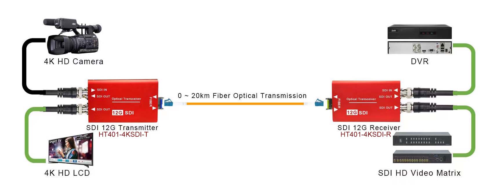 12G-SDI Series 4K Optical converter HT401-4KSDI-T/R, SMPTE ST 2082-1(12G UHD-SDI), ST 2081-1(6G UHD-SD), SMPTE424M, SMPTE292M, SMPTE259M, SMPTE297M, SMPTE305M, SMPTE305M. SMPTB3 10M standard, automatic recognition of 12G-SDV6G-SDI/3G-SD/HD-SDI/SDI/ASI inputs, suitable for long distance transmission of 4K signals.